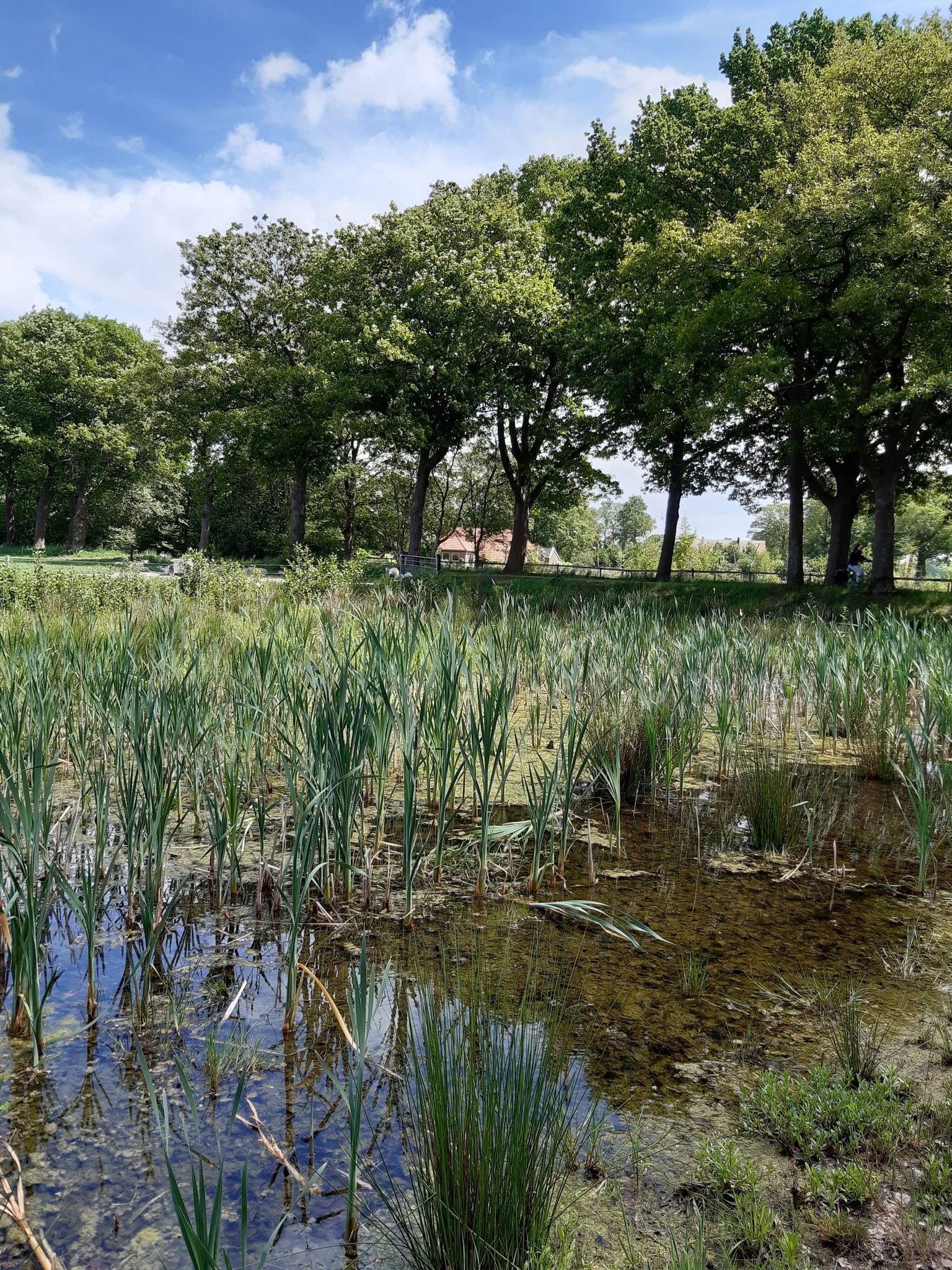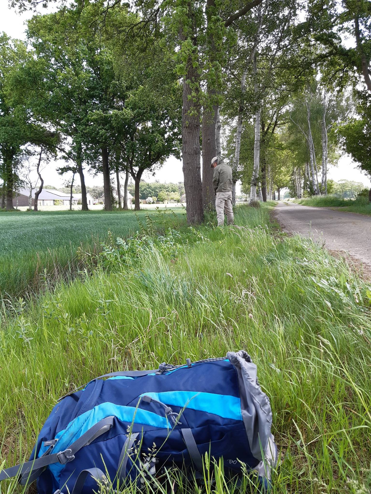 De stralende dag nodigde weer tot een wandeling uit. Gisteren leek me dat nog een hele opgaaf, nu ging het toch vanzelf. Omdat ik sinds kort ook Komoot bijhoud, koos ik de route en dat werd een nieuw stuk, over oost. Ik had al gezien dat je dan sneller in het groene gebied uitkwam. Bovendien kun je daar meer kilometers aanbreien, als de rug het welverhoopt toch doet. En dat deed ze, dus staken we nog verder door naar het oosten. Ik vond het prachtig. Veel boerderijen, weilanden omzoomd door bomen, en verrassend genoeg ook een